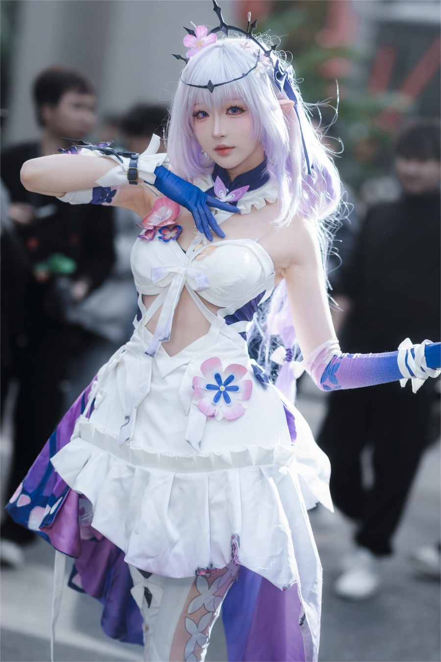 在熙攘的漫展人潮中,小南宫zzZ以一袭遐蝶扮相翩然而至,瞬间成为全场目光的焦点。这位以优雅气质著称的coser,此次将角色身上的灵动与神秘诠释得浑然天成。她身着的白色主调长裙采用层叠薄纱设计,腰间束带的紫色丝缎如夜幕初临的星云流淌,与肩部垂落的薄纱披帛形成虚实相映的层次。裙摆处手工缝制的紫藤花刺绣在灯光下若隐若现,每片花瓣都缀着细碎水钻,仿佛春日清晨凝结在花瓣上的露珠,随着她的步伐轻轻摇曳。