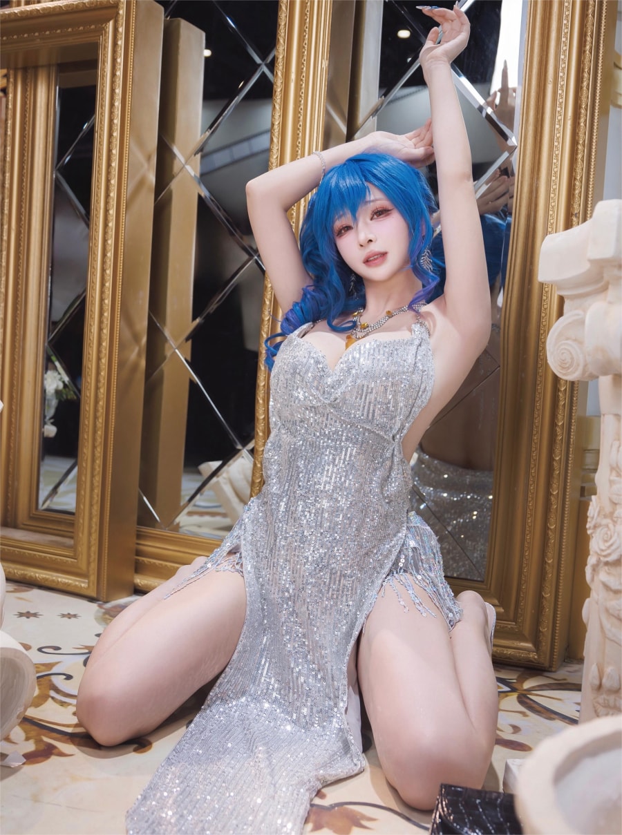 圣姨标志性的海蓝色长发被叉子宝宝演绎出独特的层次感:发丝从耳后倾泻而下时泛着深海漩涡般的幽蓝,发梢却挑染出月光穿透海面的银白色渐变。最绝妙的是那顶悬浮式头冠的设计——看似随意垂落的珍珠流苏实则以极细的鱼线固定,随着她侧身回眸的动作在空气中划出涟漪般的弧线,与肩头披散的半透明薄纱形成虚实交错的视觉魔法。礼服腰间的镂空剪裁暗藏玄机,金属骨架支撑的鱼尾裙摆随着步伐开合,露出内衬上手工刺绣的浪花纹样,每片鳞状亮片都精准对应着《碧蓝航线》原画中的粒子光效。