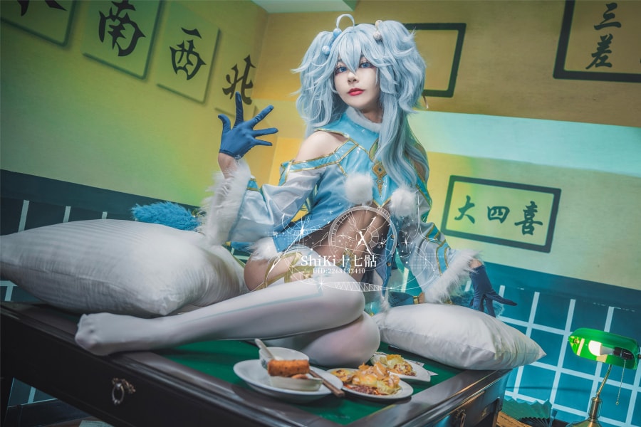 阳光穿过马卡龙色的百叶窗,在蓝白棋盘格地砖上投下糖果条纹的光影——知名coser ShiKi十七骷正俯身拨弄着草莓蛋糕上的糖霜,芙洛伦标志性的冰蓝色长发从肩头滑落,发尾卷起的弧度恰好与背景墙的螺旋纹样重叠。她突然抬眸的瞬间,指尖悬停的糖粉簌簌飘落,在镜头里化作一场微型的暴风雪,将整个甜品屋的奇幻氛围推向高潮。