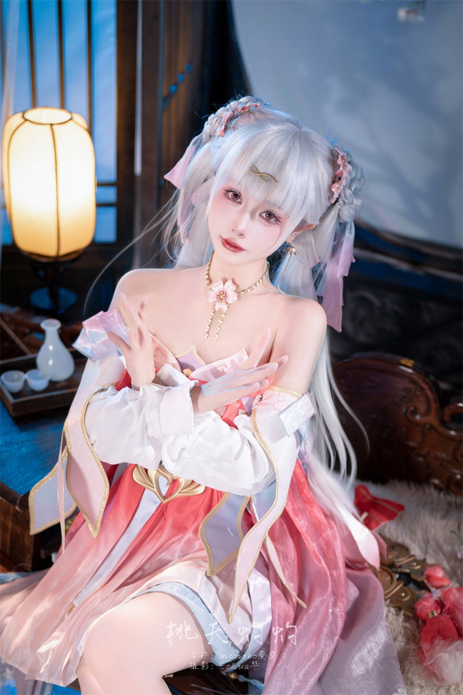 这组cos最戳人的是那些"会呼吸"的细节。银白色假发特意留了几缕没编进辫子,发尾还带着卷曲的弧度,像刚被晨露打湿。粉色花朵发饰不是规整地别在头上,而是歪斜地卡在耳后,随时要掉不掉的样子。最绝的是第二张图里茶具的摆放:茶杯没对齐托盘边缘,壶嘴还朝着反方向,这种"随手一放"的凌乱感,比精心摆拍的茶道场景更有生活气。