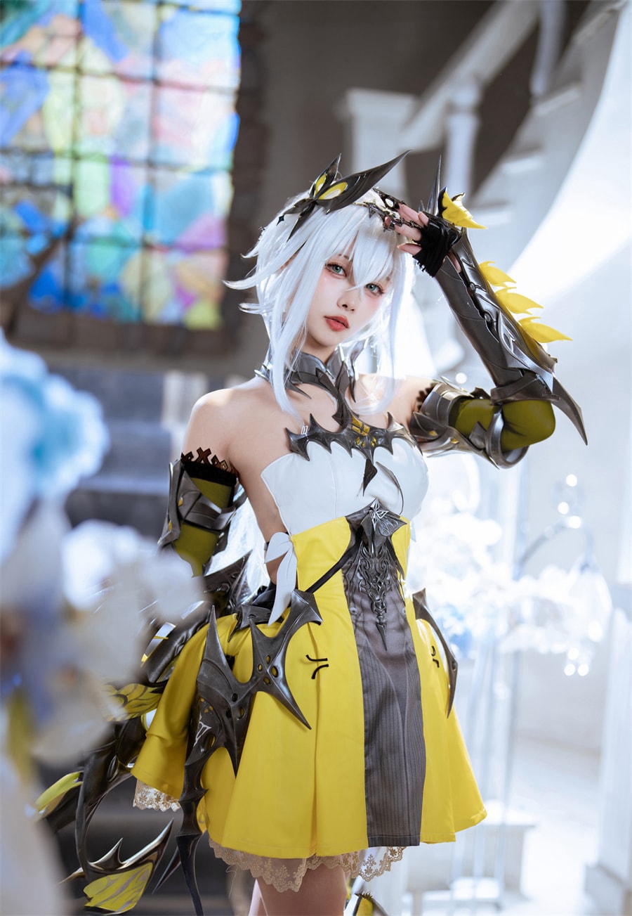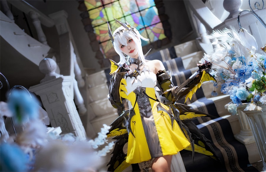黄色元素的运用很见心思。不是那种刺眼的明黄,而是像被机油浸染过的哑光黄。裙摆的蕾丝花边特意留了几处脱线,头饰上的尖角也有轻微变形。后来翻游戏原画才发现,官方设定集里确实提到赛琪"总爱把装备改造到变形"。Momoko葵葵连这种冷门细节都挖出来还原,难怪有玩家留言说:"看了你的cos才发现立绘右下角真的画着工具痕。"