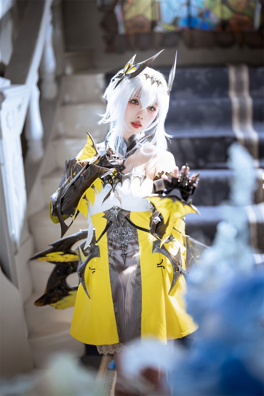 凌晨整理cos图库时,又翻到Momoko葵葵这组赛琪cos。第三张她坐在楼梯转角的样子特别戳人——白色长发垂在黄色裙摆上,发尾沾着几根不易察觉的蓝色纤维,像是刚从某个奇幻战场归来,还没来得及整理自己。
