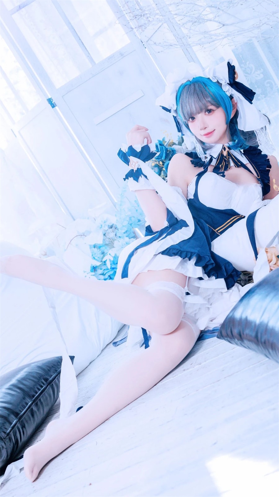 而那奶白超薄的白丝,刚刚过膝,更是整个 cosplay 的点睛之笔。它如一层轻柔的云雾,包裹着她修长的双腿,透露出一种纯洁而又迷人的气息。那细腻的质地,在光的照耀下微微闪烁,仿佛是星星洒落在人间。每一次她的动作,白丝都会轻轻飘动,如同翩翩起舞的蝴蝶,让人的目光不由自主地被吸引。