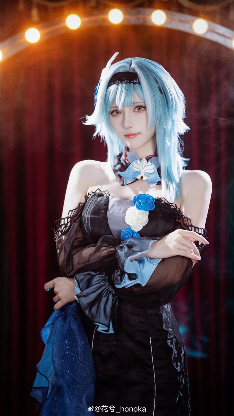花兮_honoka 对优菈的 cosplay 堪称一绝。那身黑色礼服贴合着她的身体曲线,如同第二层肌肤般细腻。礼服的剪裁精致,每一处褶皱与线条都恰到好处地展现出优菈的婀娜身姿。黑色的绸缎在灯光下泛着柔和的光泽,仿佛流淌着神秘的音符,与音乐会的氛围相得益彰。她的腰间或许系着一条精致的腰带,更凸显出纤细的腰肢,裙摆如行云流水般垂落,随着她的动作轻轻摇曳,似在翩翩起舞。