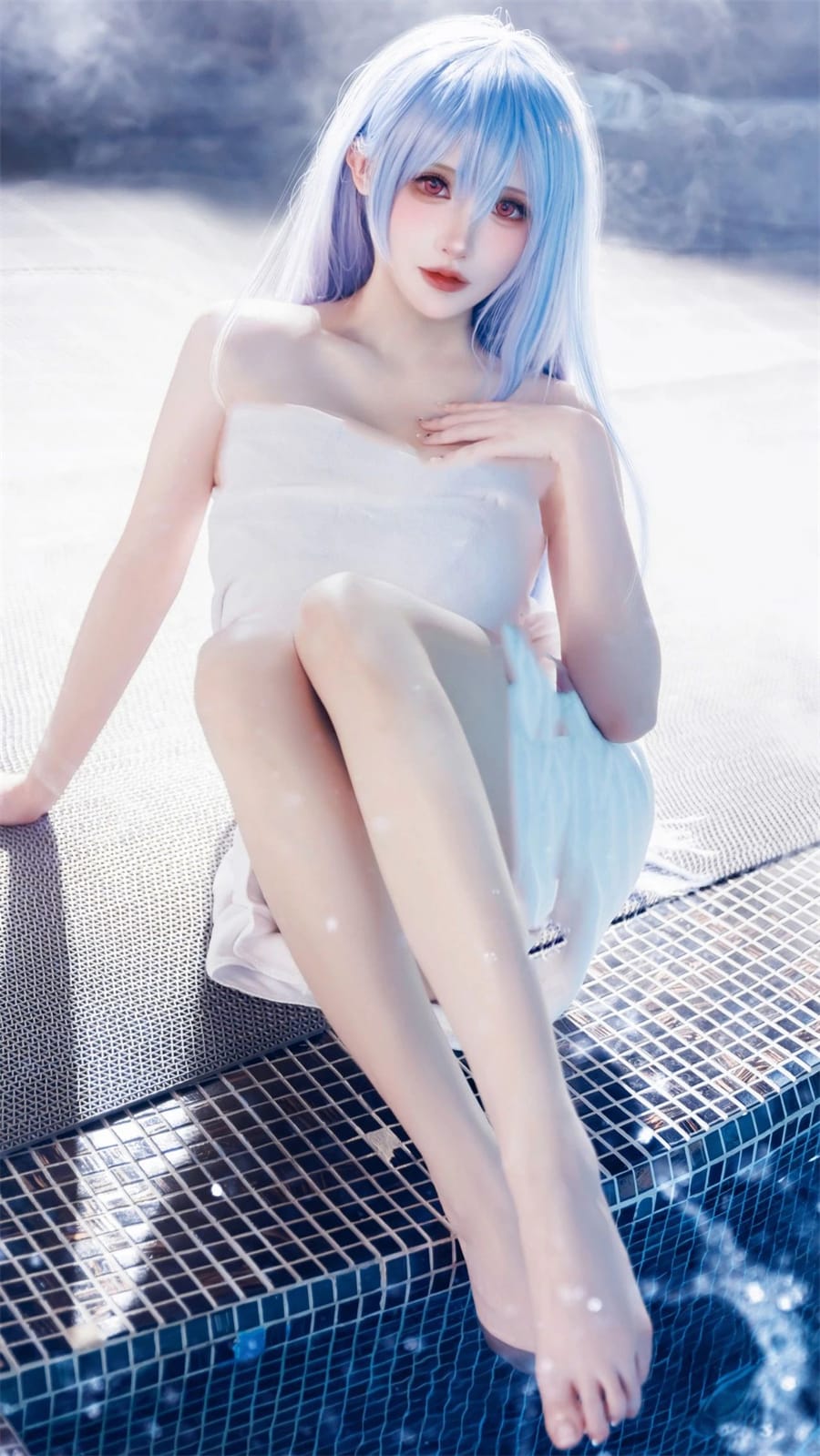 炼奶 Mayoi 对伏罗希洛夫的演绎细致入微。从泳衣的选择到配饰的搭配,都恰到好处地展现了角色的特点。泳衣的剪裁凸显出她的身材优势,而配饰则为整个造型增添了精致感。她的神态更是将伏罗希洛夫的魅力展现得淋漓尽致。眼神中带着一丝俏皮与灵动,仿佛在与泳池中的水精灵嬉戏;微微上扬的嘴角,似笑非笑,又像是在享受着这片刻的宁静与美好。