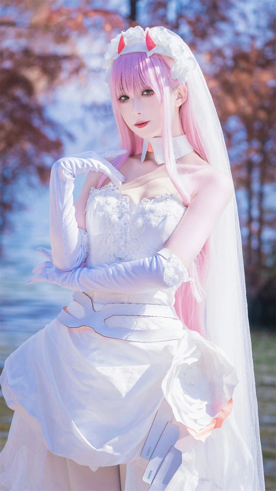 在动漫的奇幻世界里,02 的花嫁形象宛如一颗璀璨的星辰,闪耀着独特的光芒。当 coser 封疆疆身着那套洁白如雪的花嫁服饰出现在海风习习的场景中时,仿佛是从童话中走来的公主,带着梦幻与温柔,让人心生向往。