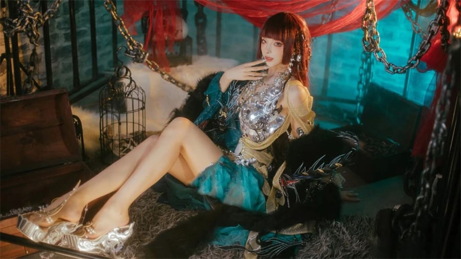 从服装设计上来看,原天夕子所穿的琉璃碧羽孔雀造型忠实还原了游戏中的角色形象。羽衣的蓝绿色调与细腻的羽毛细节相得益彰,整体造型既充满仙气,又带有强烈的视觉冲击力。她那一头波浪般的长发,搭配上孔雀羽翼般的装饰,完美地展现了琉璃碧羽孔雀的高贵与冷艳。