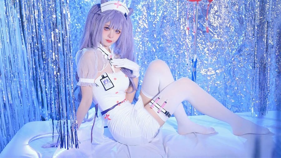 从整体效果来看,这组作品不仅仅是一套简单的Cosplay,它通过服装、姿态和表情等多方面的配合,打造出了一种别具一格的刻晴形象。白色过膝袜和护士服的搭配,不仅强化了角色的职业特征,也为作品增添了一种独特的魅力。这种在温柔与性感之间的平衡,恰恰是刻晴这一角色的独特之处,展示了Cosplay艺术的无限可能性。