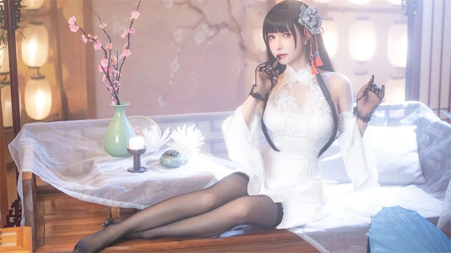 当薄雾般的烟纱轻轻散去,超级小禾儿演绎的《碧蓝航线》逸仙·改宛如从水墨画中款款走出。改造后的新式旗袍完美勾勒出东方女性的优雅曲线,粉白相间的衣料上绣着精致的桃花暗纹,在镜头前泛着珍珠般的光泽。最绝的是她眼尾那抹被"桃花亲吻"的绯红,将逸仙特有的娇羞与柔美展现得恰到好处。