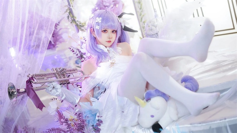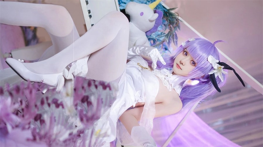 当月光凝成实体坠落人间,@阳炎型小菠萝 用一袭「幸福乐章」主题的独角兽cos作品,在现实世界重构了《碧蓝航线》中最具神性的美学符号。这组摄影并非简单的角色复刻,而是一次对圣洁与梦幻的深度解构。