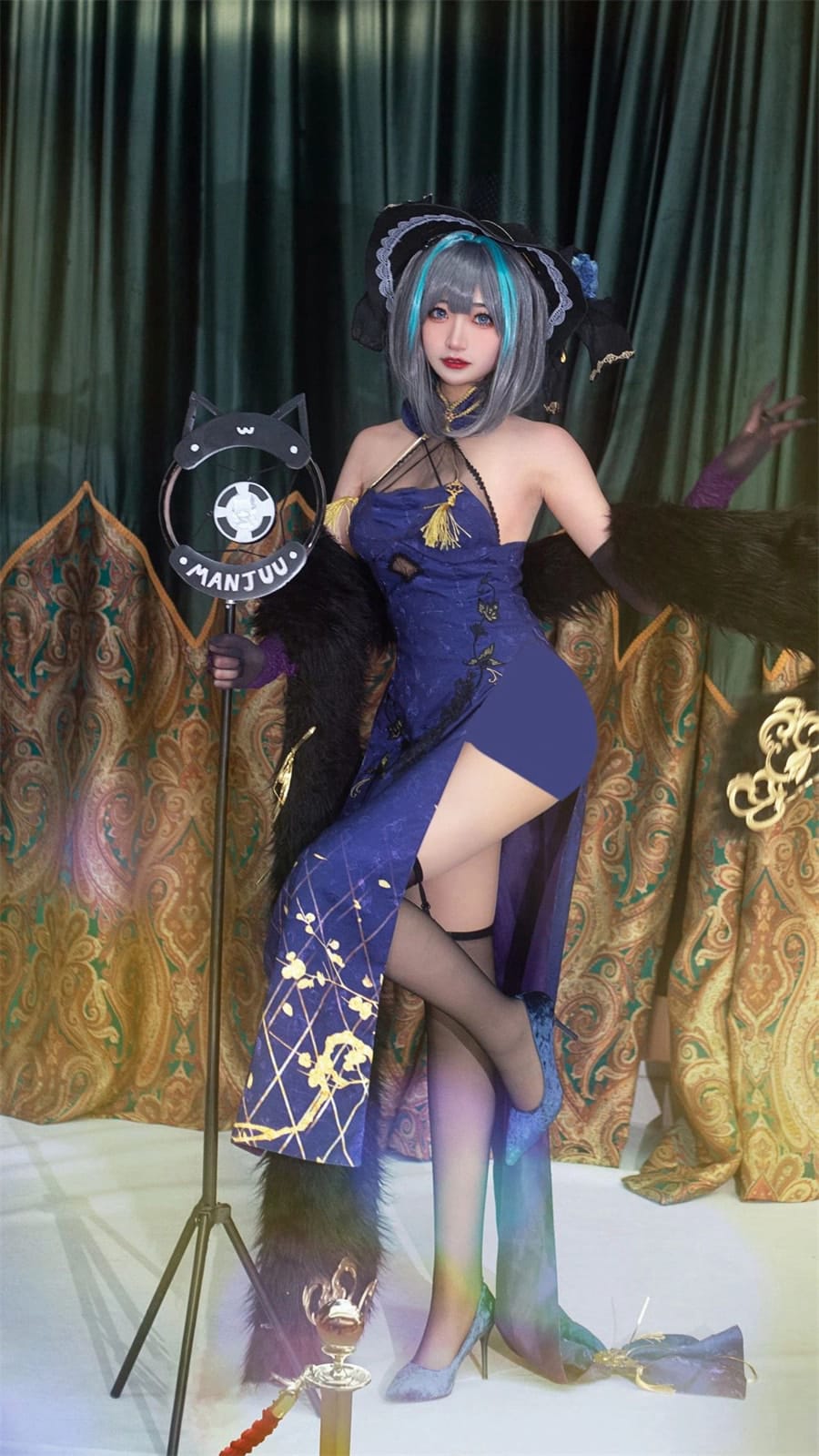 修长的黑色丝袜与尖头高跟鞋的组合,为这套cos增添了成熟魅力。Niki又困了特别选择了带有细微竖纹的丝袜,在视觉上进一步拉长腿部线条。高跟鞋的金属装饰与礼服上的金边呼应,细节处的统一让整体造型更显精致。在几张全身构图中,她交叉双腿坐在欧式椅上的姿态,将柴郡既优雅又带点小恶魔的气质完美释放。