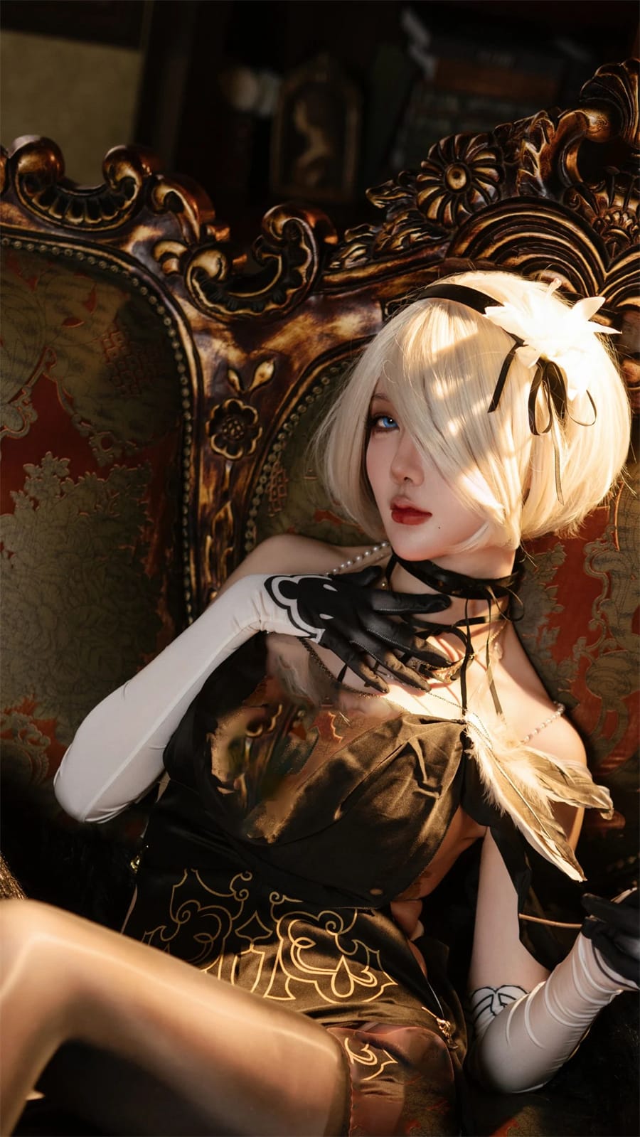 当月光穿透哥特式彩窗,那个静立在古籍间的身影让机械与生命的分界彻底模糊——阿洛洛洛大魔王演绎的2B同人礼服,用最克制的黑白配比,完成了一场关于"人造之美"的视觉论证。这不是简单的服装复刻,而是一次对寄叶部队美学的深度解构。