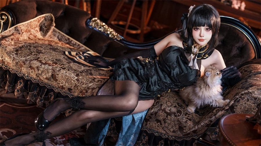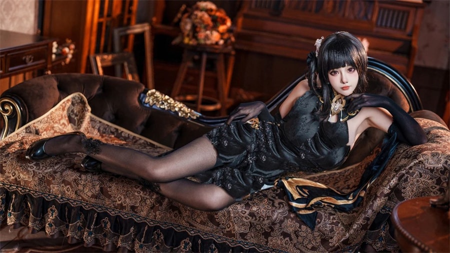 当水晶吊灯的光晕在鎏金墙纸上晕染开来,那个端坐于雕花椅背的身影让整座宫殿都成了她的陪衬——凛子酱诠释的镇海·奇奢华苑,用最纯粹的黑与最华丽的金,在巴洛克式的浮华中复刻了一场关于海洋女王的视觉史诗。这不是简单的角色扮演,而是一曲将舰装美学融入古典艺术的灵魂共振。