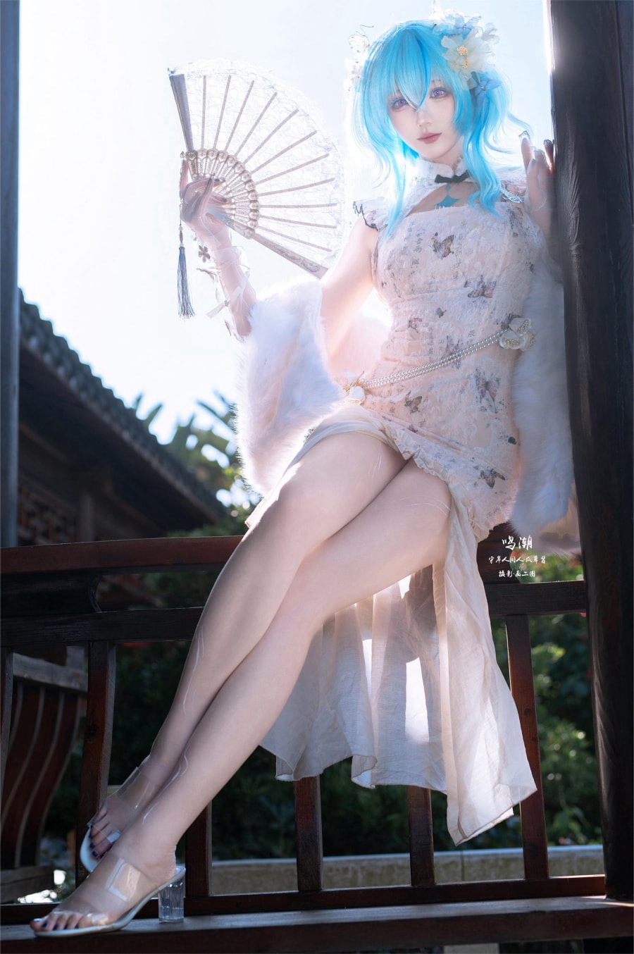 瓜希酱的仪态把控让二次元与三次元达成完美共振。交叠的双腿姿势复刻了游戏过场动画中的经典构图,指尖轻点扇骨的动作则带着守岸人特有的疏离感。最传神的是她眼神的层次——右眼含着海雾的朦胧,左眼却因美瞳的特殊虹膜纹路保持着观测潮汐的锐利,当一阵穿堂风突然掀起她的发丝,那些在蓝绸上流动的光影突然有了浪涌拍岸的韵律感。