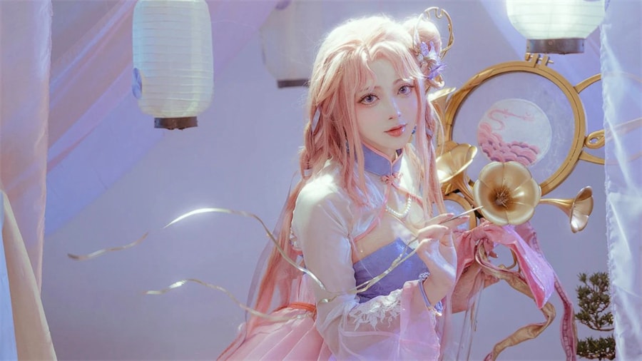 当月光穿透薄纱灯笼的瞬间,那个手执莲花的倩影让整个空间都化作了流动的织锦——枣糕-吃谷人黛博魂诠释的王昭君,用最深邃的蓝与最温柔的粉,在纱幔与光影间编织出一场跨越千年的乞巧之约。这不是简单的角色复刻,而是一次将盛唐美学注入现代视觉的惊艳实验。